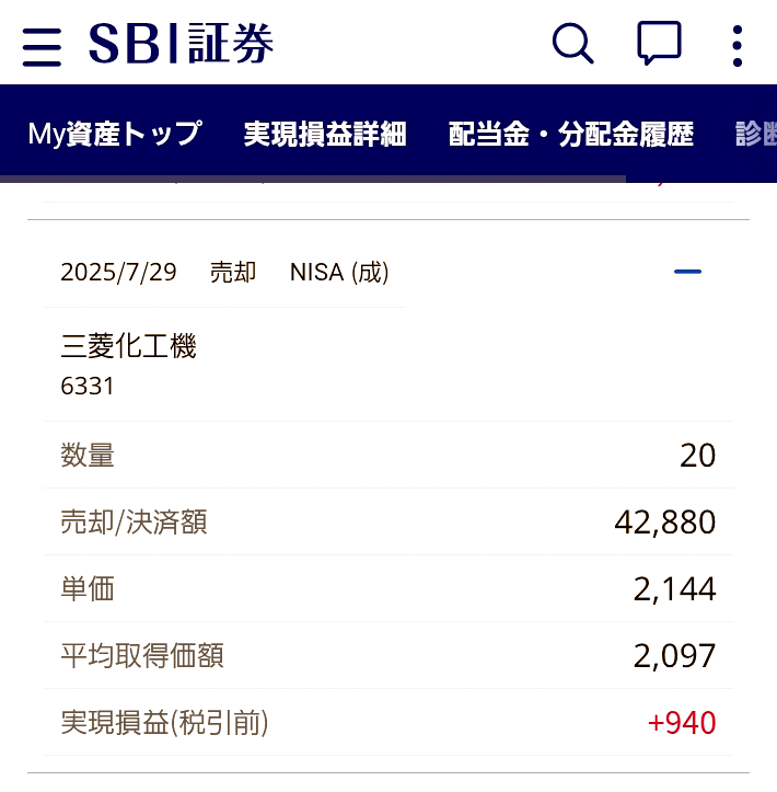 本を読んでから挑戦したのは三菱化工機(6331)である。2025年7月16日(水)に10株を購入し、さらに7月28日(月)に10株を買い増した。これが初めての「買い増し」という経験だった。ただ、投資ノートを見返しても理由が思い出せないが、翌29日(火)には売却していた。結果は+940円。大きな金額ではないが、またしても集中投資によって利益を確保できたことは貴重な体験であった。