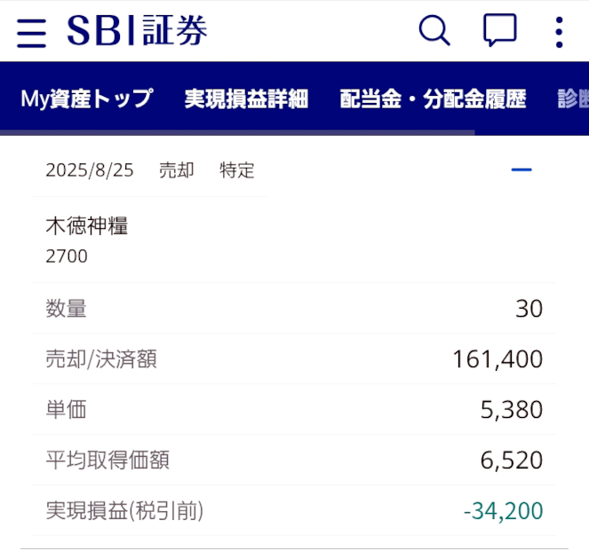 買った当日、スマホの画面を見て驚いた。株価が爆下がりしていたのだ。終値は5,870円で、前日比-550円。含み損は-19,500円になってしまった。血の気が引いた。万単位のマイナスは初めてだったからだ。さらに悪いことは続くものだ。週明け8月25日(月)、損失が怖くなり成行で売却。結果はさらに下がって、最終的な損失は-34,200円。これまで積み上げてきた年間の利益が一気に吹き飛んでしまった。ベテラン投資家にとっては微々たるものだろうが、初めての万単位のマイナスは苦い経験として深く心に刻まれた。
